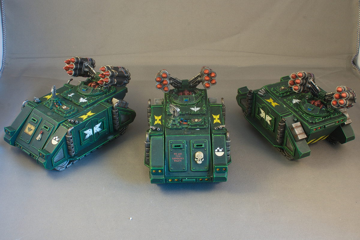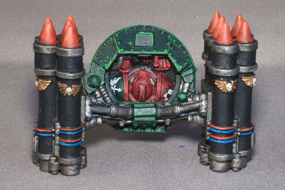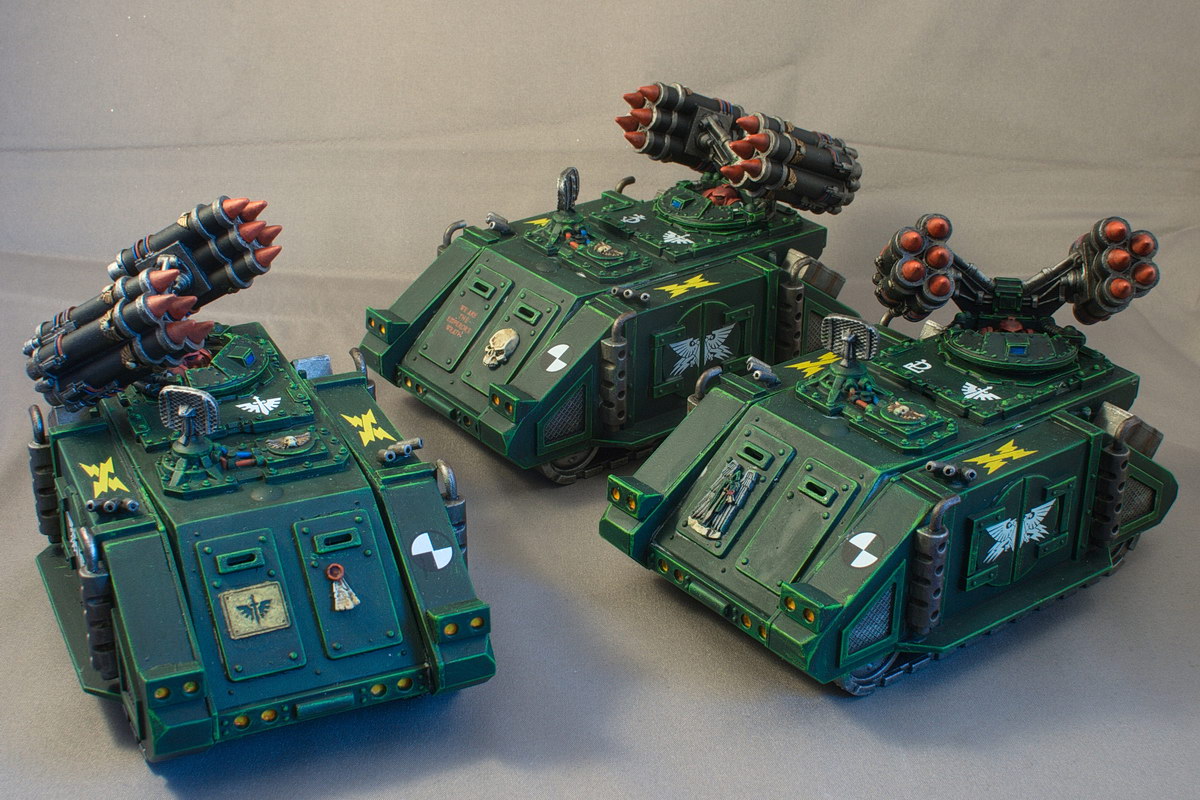 The whirlwinds weren’t fielded exactly as pictured here. During cleanup, somebody flipped over one of them, causing the turret to ‘go to ground’. So last weekend I spend some time restoring it. Since I was working on the Whirlwinds anyway, I also re-did the company badges. I’ve been planning to convert my army to a 4th company one, as the Dark Vengeance set has meant there are now way too many 5th company armies around. I’m probably going to hate myself after painting a bunch of checkered flag company badges, but for now I’m happy with it.