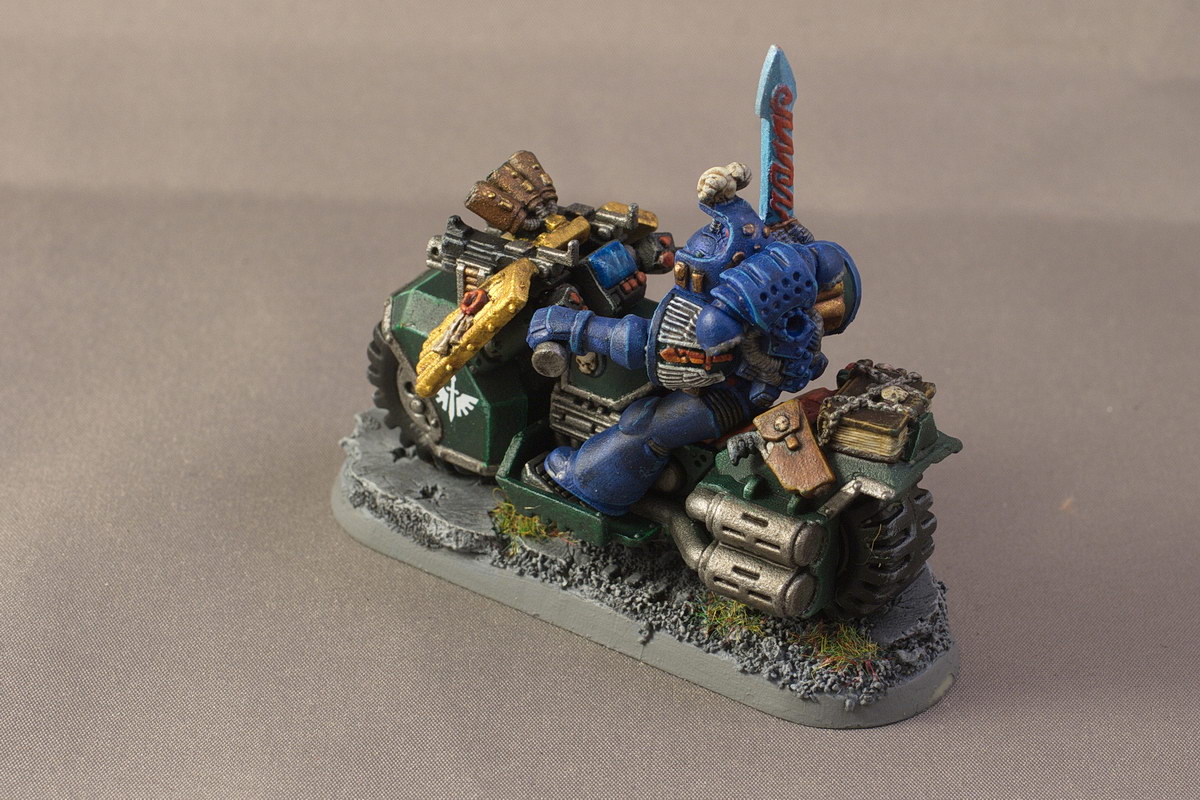 The bike is mostly the bike from the old bike-mounted chaplain kit. Which in turn was just a normal bike with a few metal bits added on: A fancier front guard, some items on the back and holstered boltgun. I removed the skull helmet from the rear stowage, but other than that it’s mostly stock.
