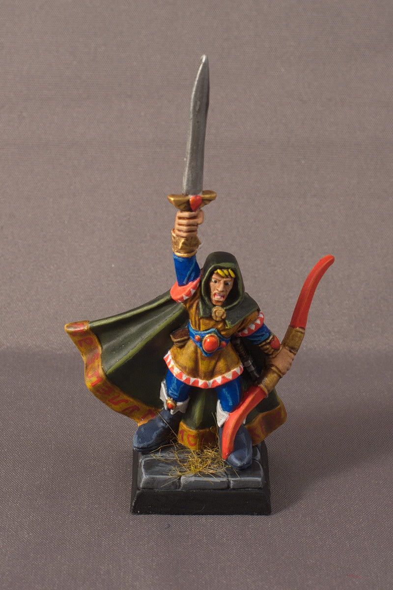 The colours for this model differ the most from what I’d done if I wasn’t simulating the reference cards. Left to my own devices, he would have either ended up as Gandalf or as a red (fire) wizard. That said, I really like how he turned out. The shine on the gemstones and bottle was done by going over those areas with a gloss varnish (After varnishing everything else with a matt varnish first, which is my standard).